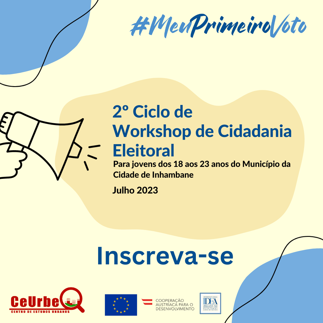 O Centro de Estudos Urbanos de Moçambique, lança o 2º ciclo da 1ª edição de Workshop de Cidadania Eleitoral para Novos Eleitores do Município da Cidade de Inhambane, a realizar-se no mês de Julho 2023. Este workshop tem por objectivo familiar os novos eleitores com os conhecimentos cívicos e actos de cidadania. Neste ciclo poderão participar apenas os jovens que não participaram do primeiro ciclo, cada um poderá participar em apenas uma secção e as vagas são limitadas.